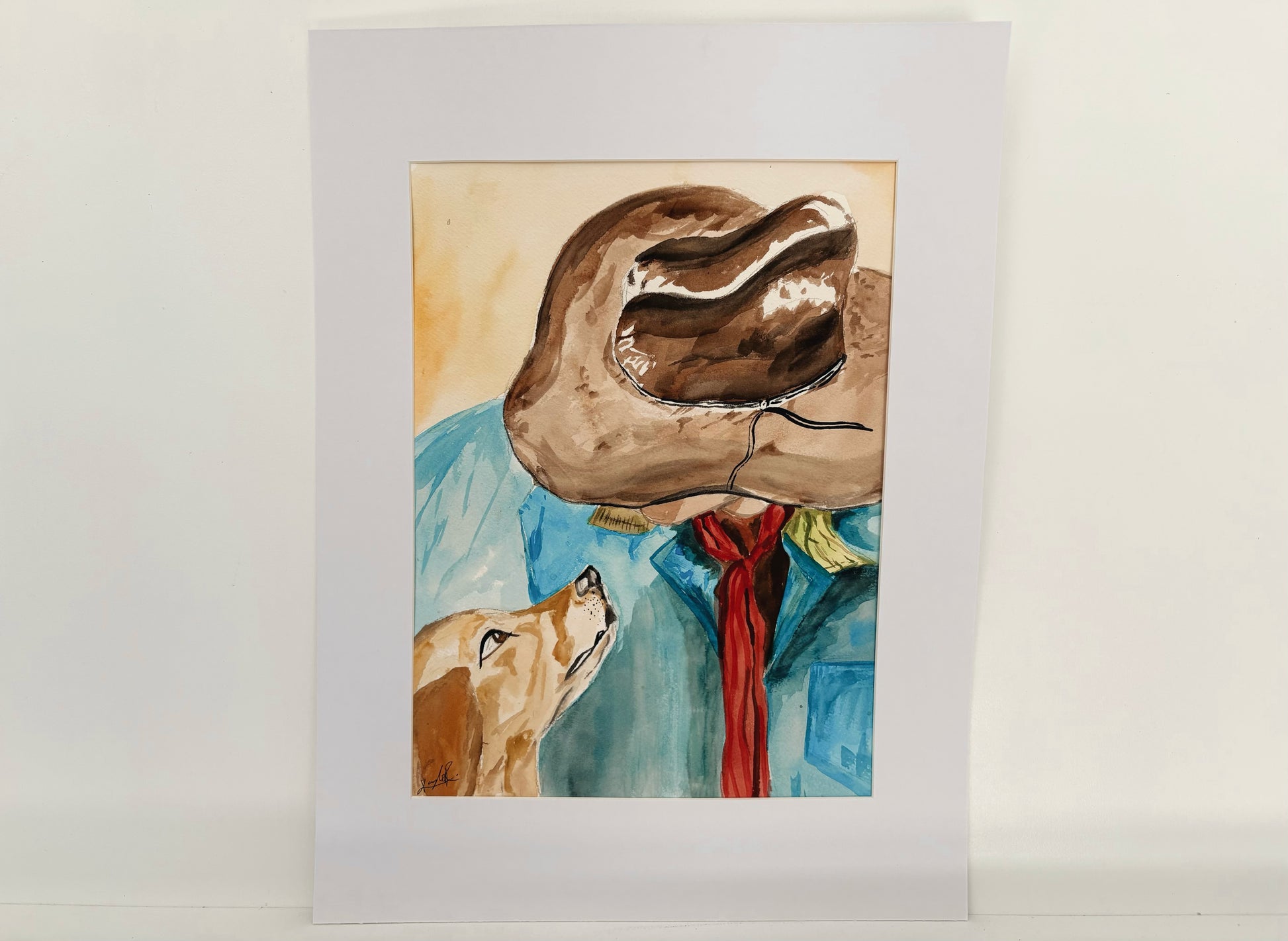 Best Friend is a 9x12 watercolor painting, matted to 12x16, created on premium watercolor paper. It depicts a cowboy looking down at his golden retriever, capturing a tender, heartfelt moment between man and dog. Perfect for adding warmth and charm to any room.