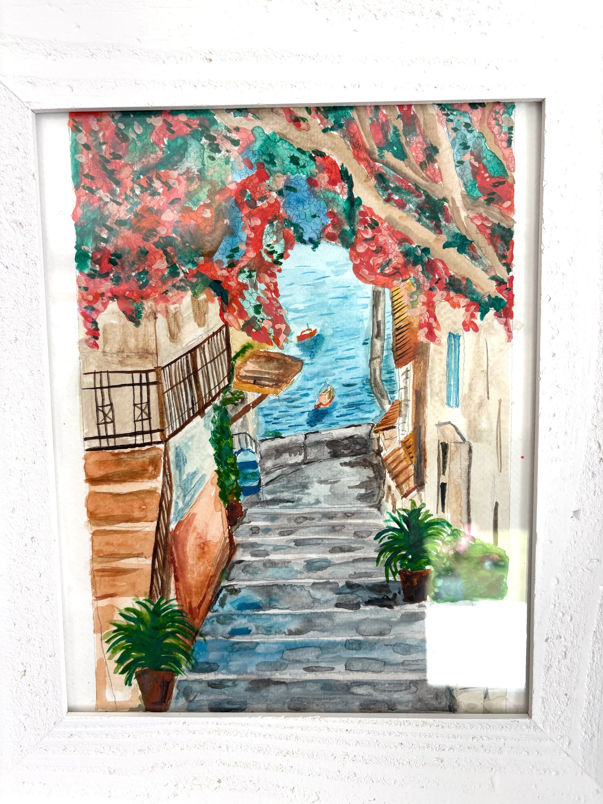 This original watercolor, One Step, captures a moment of quiet beauty in an 8x10 composition, framed to 11.5x13.5. With soft tones and thoughtful detail, the piece invites reflection and adds a calming touch to any room. Its handcrafted charm makes it a wonderful choice for anyone looking to bring warmth, simplicity, and a personal story into their home décor.